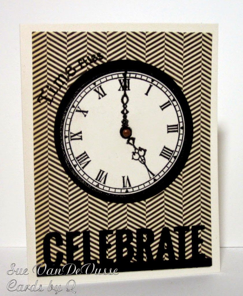 I've had the clock and sentiment set for a long time and have no clue who it is by. Stamped the clock with Versafine Onyx, then die cut it with a circle die. The clock isn't perfectly round, so I hand trimmed it and layered onto a black circle and added a copper brad to the center.. Found this fun dp in my stash, it really plays tricks with you eyes. Added the die cut celebrate and adhered to an ivory base (110 lb heavy weight cardstock from Michael's). I really need to find a stamp that says "It's 5 o'clock somewhere".